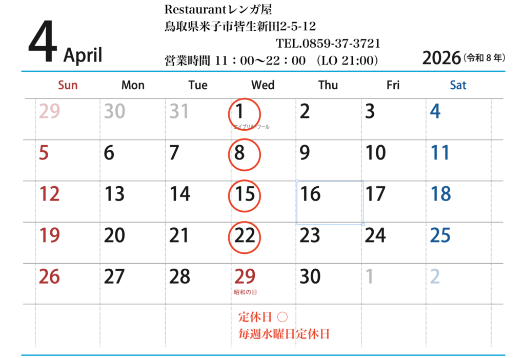 ご来店の際は、以下の店休日をご確認いただけますと幸いです。
